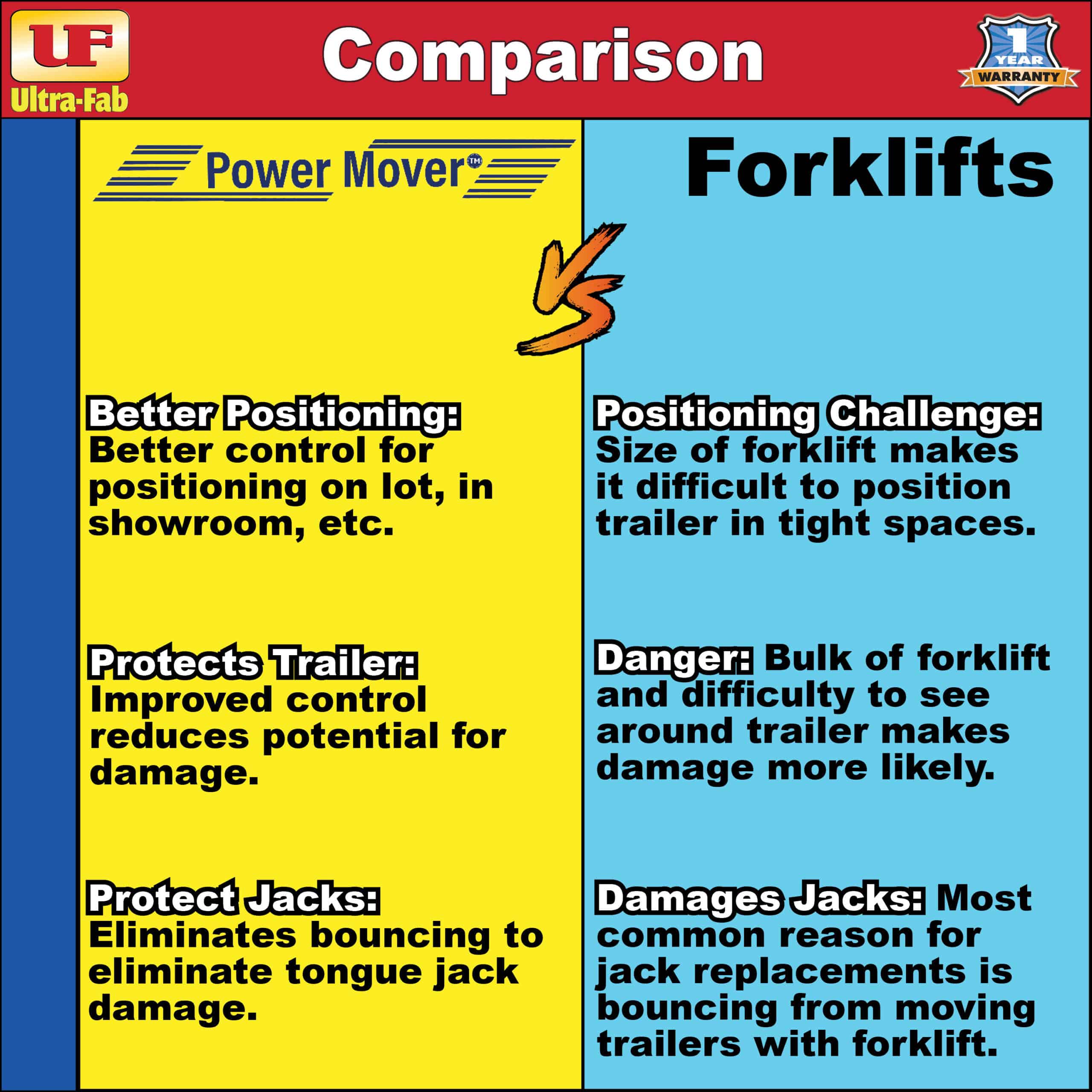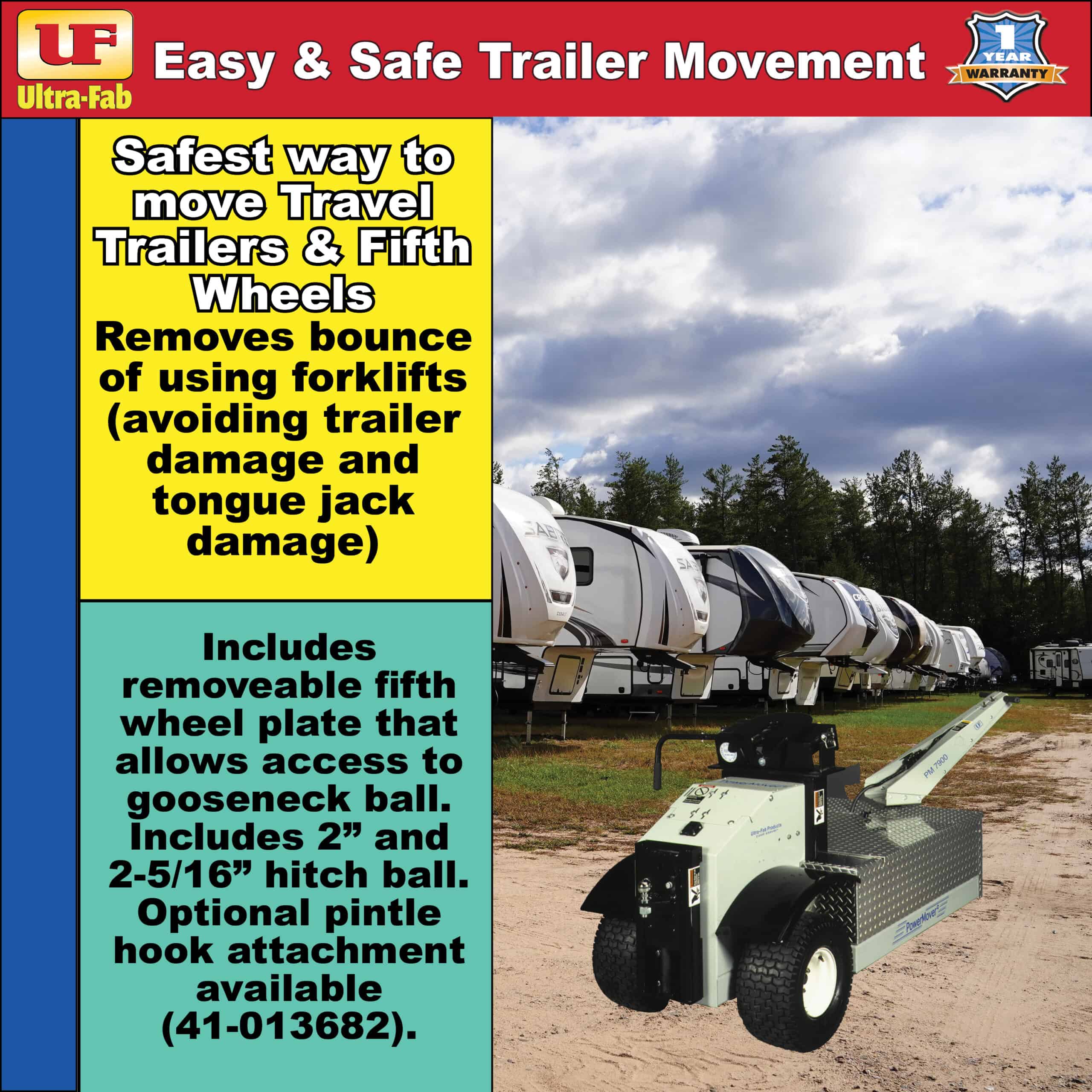 - Ultra Versatile Trailer Mover: Moves Fifth Wheel, Gooseneck and Travel Trailers. Removes bounce experienced when using forklifts, thus avoiding damage to trailer and especially to tongue jacks. Includes removeable fifth wheel plate allowing access to gooseneck capabilities. Also includes a 2” and a 2-5/16” hitch ball to move all known trailer types. Pintle hook attachment sold separately (41-141055).