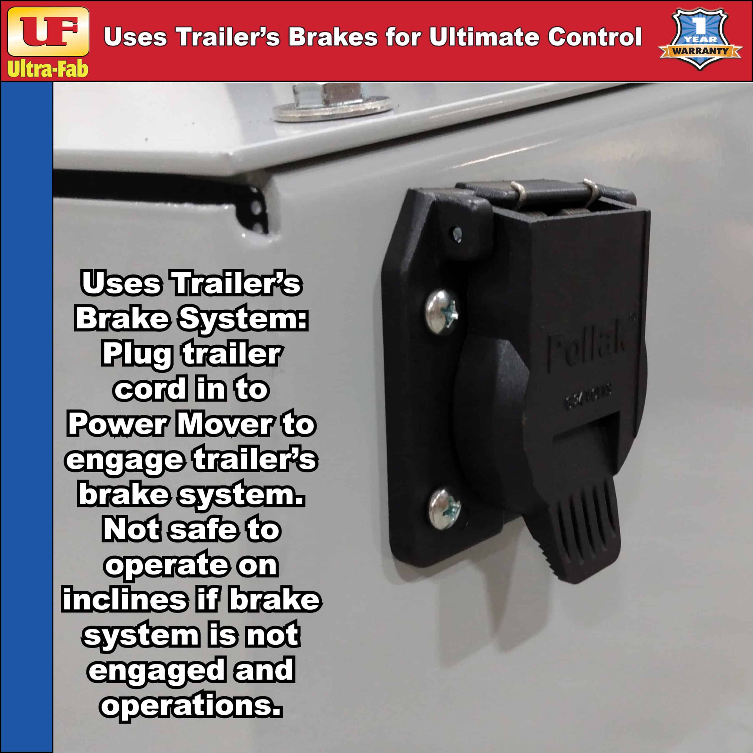 - Uses Trailer’s Brake System: Plug trailer cord in to Power Mover to engage trailer’s brake system. Not safe to operate on inclines if brake system is not engaged and operations.